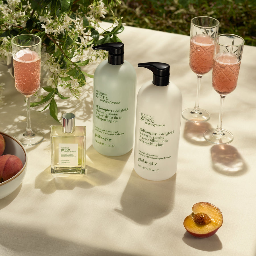 find a moment of summer joy with our new, limited-edition philosophy summer grace endless afternoon hydrating shower gel. notes of sparkling peach, blooming jasmine, and sandalwood transport you to a sundrenched garden party. the floral peach perfume captures the joyful energy of a laughter-filled afternoon under the sun with your closest friends.